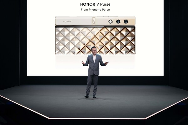 与此同时,时尚折叠屏荣耀V Purse概念首次亮相,荣耀将一向以科技感著称的折叠屏手机,重塑为设计感十足的时尚单品。薄于9mm的厚度,使其成为全球最轻薄的折叠屏,而钱包形态更是重新定义未来智能手机。荣耀V Purse将外折屏重构为可穿戴的时尚单品,以数字包包代替实体,换壁纸如同换包包的长效设计,掀起了科技与时尚的新一轮有机融合。