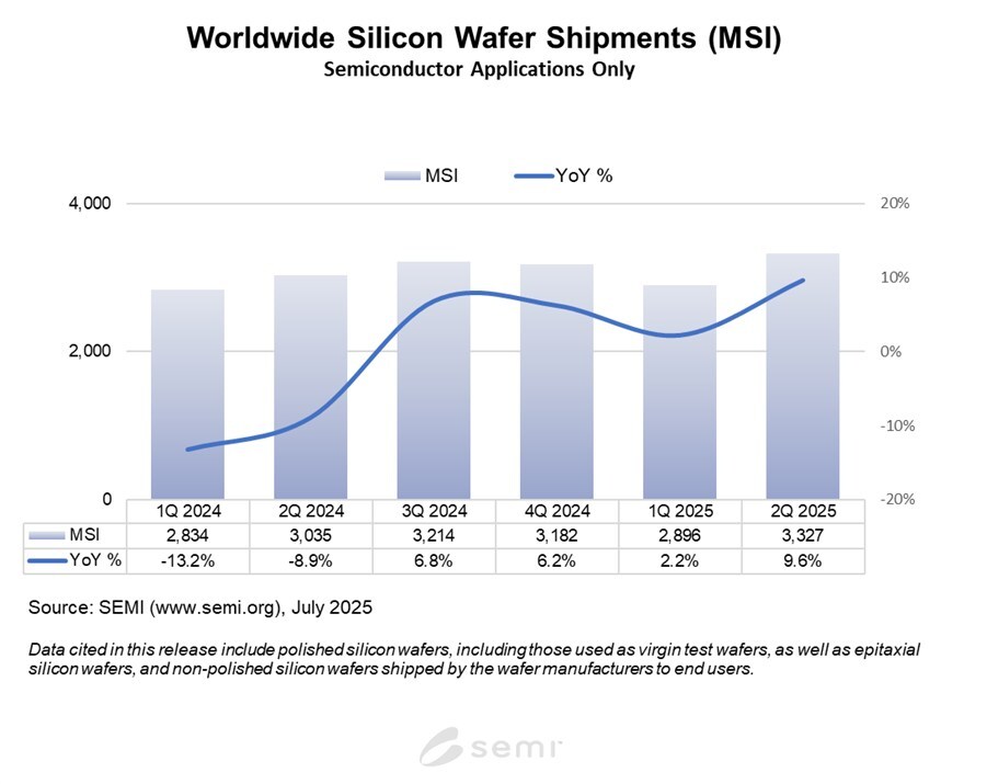 2025年第二季度全球硅晶圆出货量较去年同期增长近10%