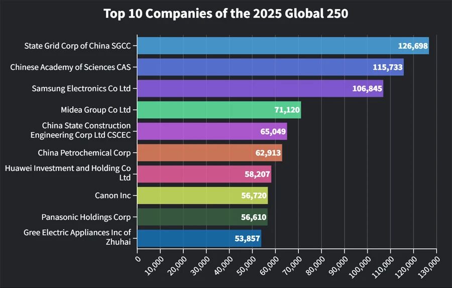 2025年度全球100个最活跃专利持有者,中国实体在前十中有七名