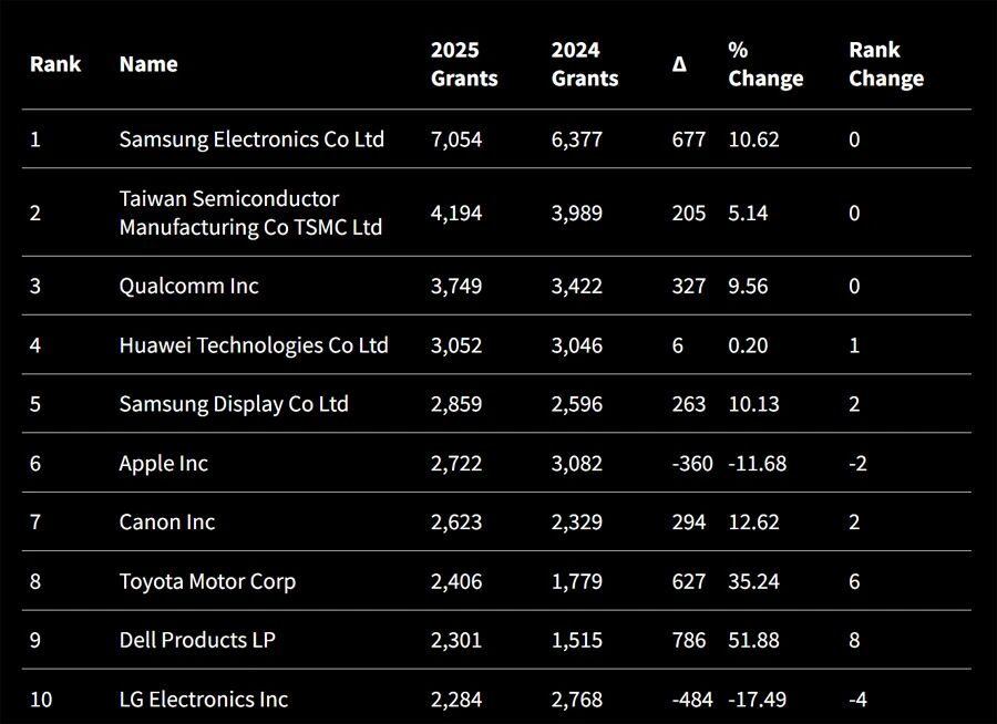 2025年美国专利申请量50强榜单,华为、京东方、中兴、腾讯上榜