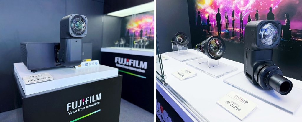 本次展会是新品FP-ZUH12000在中国的首次展示。作为富士胶片“Z系列”超短焦投影机中首款可更换镜头式投影机,其支持4K超高清投影,色彩还原和层次表现出色,最大亮度可达12000ANSI流明,可应对艺术空间、博物馆等有环境光的复杂场景。其紧凑轻量化的设计(机身重量约18.1kg)也便于运输和安装。配合新品,富士胶片还同步推出了三款可选镜头:超短焦镜头“FP-ZL034”、短焦镜头“FP-ZL050”与标准镜头“FP-ZL125”。本次展台还设置了富士胶片“Z系列”投影机另一主力机型FP-ZUH6000的实机展示区。该机型支持4K分辨率与6000ANSI流明高亮度,并且延续了“Z系列”标志性的“折曲式双轴旋转镜头”结构。